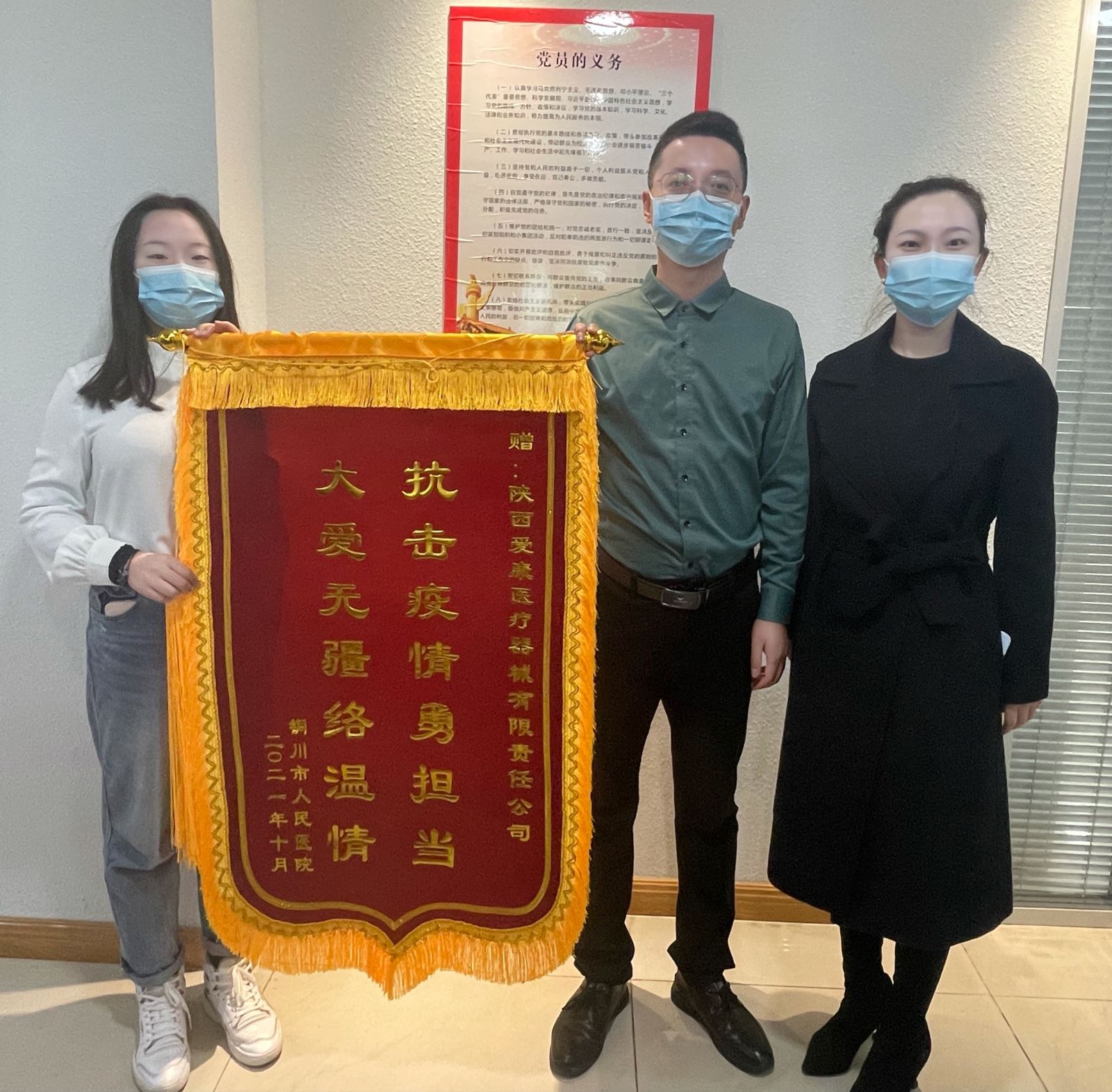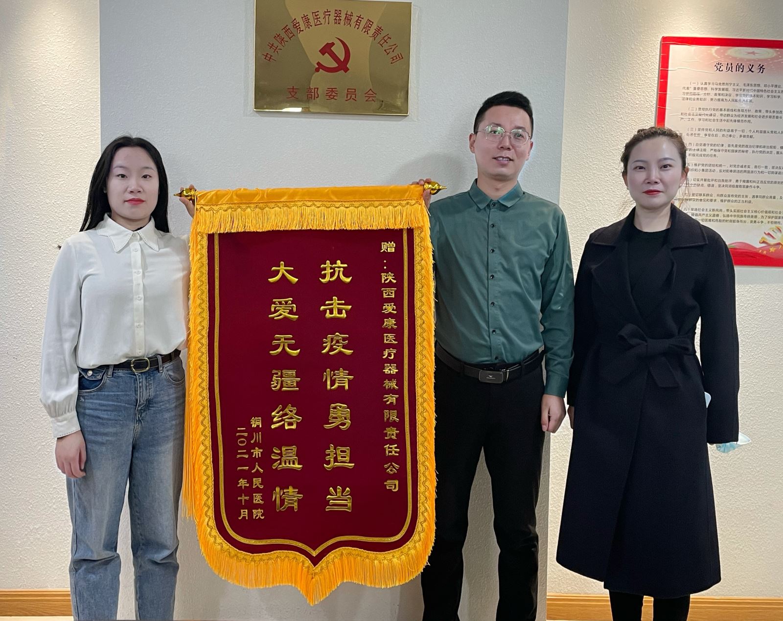 2021年10月,愛康集團(tuán)銷售副總夏蓓蓓在銅川市人民醫(yī)院進(jìn)行業(yè)務(wù)溝通時(shí),醫(yī)院方將一面寫有“抗擊疫情勇?lián)?dāng),大愛無疆絡(luò)溫情”的錦旗送至夏副總的手中,感謝我司在整個(gè)抗擊疫情的過程中對醫(yī)院的全力支持。